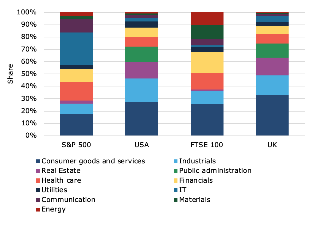 Промышленные предприятия и потребительские товары и услуги также значительно недопредставлены на фондовом рынке. На самом деле, приведённый выше график показывает, что ВВП США и Великобритании выглядят довольно схоже, но два фондовых рынка это совсем не отражают.