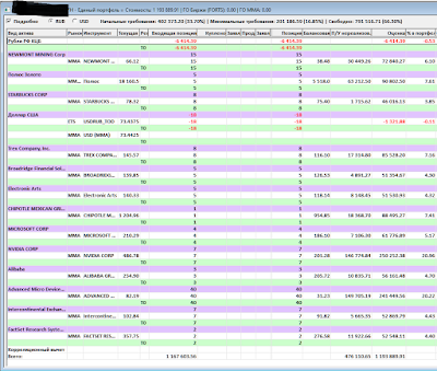 Сравнить эти результаты можно по ссылке выше, и заметьте, что с тех пор я не изменил состав портфеля ни на грамм. Я ожидал перераспределение портфеля в том обзоре после сезона отчётов, уже есть список кандидатов на замену, но на таком дивно растущем рынке вмешиваться не стоит, а состав можно будет скорректировать на ближайшей коррекции. Правило "не мешай работать механизму" в такие периоды работает лучше всего.
